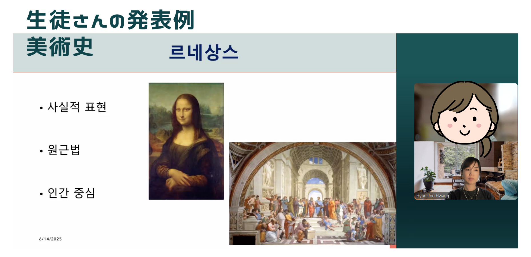生徒さんと講師が交互にテーマについて調べ、資料を準備し、発表します。